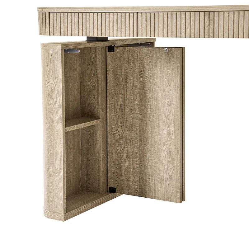 Aggiorna il tuo spazio di lavoro con questa scrivania elettrica regolabile in altezza in stile americano, progettata per funzionalità ed eleganza. Il meccanismo elettrico di sollevamento della scrivania regolabile in altezza consente regolazioni fluide, permettendoti di passare senza sforzo dalla posizione seduta a quella in piedi per una routine di lavoro più sana. Con un elegante dettaglio a listelli, questa scrivania regolabile aggiunge un tocco sofisticato all'arredamento dell'ufficio. Le opzioni di stoccaggio sono abbondanti, con una mensola interna su entrambi i lati per riporre oggetti nascosti, completa di ante a battente con apertura a pressione per un facile accesso. Sotto il piano del tavolo, tre ampi cassetti offrono guide morbide e autoinciudibili, garantendo un utilizzo silenzioso e fluido. Mantieni il tuo spazio di lavoro organizzato con la gestione dei cavi integrata, progettata per nascondere in modo ordinato i cavi e mantenere una scrivania pulita e sistemata. Questa scrivania elettrica regolabile fonde estetica elegante con funzionalità moderna, rendendola la scelta perfetta per un ufficio domestico o un ambiente di lavoro contemporaneo.